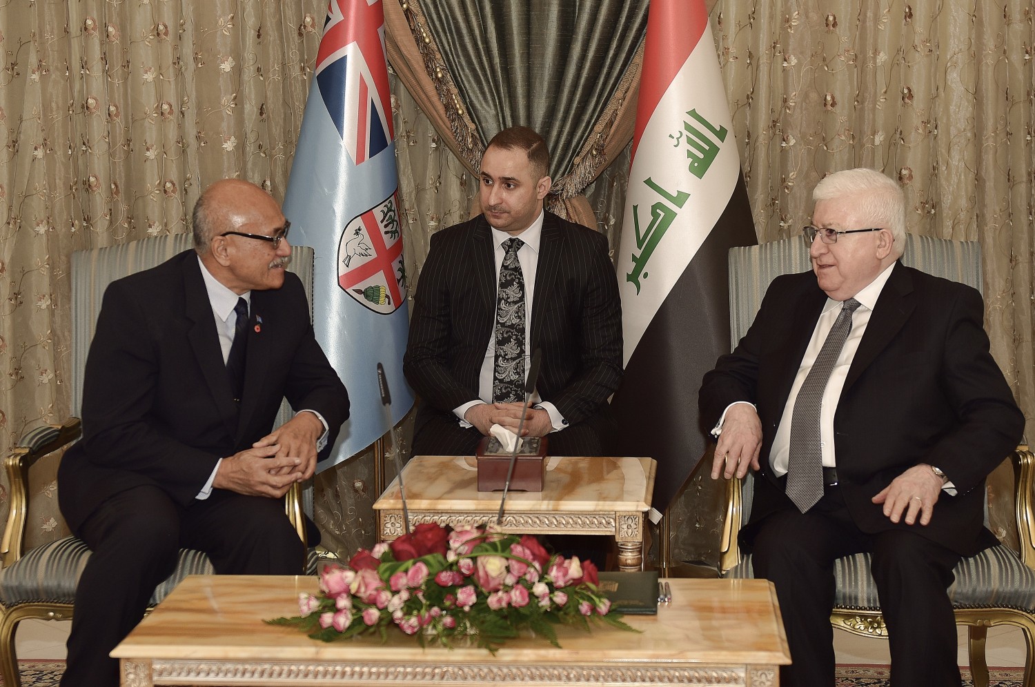 أكدَ الرئيس الفيجي، خلال لقائه رئيس الجمهورية فؤاد معصوم استعداد بلاده للوقوف مع العراق في حربه ضد داعش. وذكر بيان رئاسي، نقلته وكالة {الفرات نيوز} ان “الرئيس فؤاد معصوم استقبل صباح امس في قصر السلام ببغداد، رئيس جمهورية فيجي جيوجي كونوسي كونروتي, حيث رحب الرئيس معصوم بزيارته للعراق والذي جاء لتفقد الجنود الفيجيين الموجودين في العراق ضمن قوات الأمم المتحدة”. وعبر معصوم، بحسب البيان، عن “رغبة العراق في تطوير العلاقات الثنائية بين البلدين الصديقين، على مختلف الصعد السياسية والأمنية وفي المحافل الدولية”, مشيدا بـ”أداء الجنود الفيجيين وهم محل ثقة لدى الحكومة العراقية”. وأشار الى ان “العراق هو مهد الحضارات الانسانية”, لافتا إلى ان “إرادة العراقيين في الوقت الحاضر على العمل وإصرارهم لدحر المجاميع الارهابية وتجاوز الازمات وتمتين دعائم دولة ديمقراطية مزدهرة وقوية”, متمنيا ان “تكون هذه الزيارة فاتحة لتوسيع التعاون البناء بين جمهورية العراق وجمهورية فيجي”. من جانبه عبر الرئيس الفيجي، عن “امتنانه للرئيس معصوم على حفاوة الاستقبال”, مؤكدا “استعداد بلاده للوقوف مع الشعب العراقي في حربه على داعش الارهابي, فضلا عن العمل لتعزيز العلاقات بين البلدين في شتى المجالات”. وقدم الرئيس الفيجي “شكره للعراق على مساندته لجمهورية فيجي في المحافل الدولية”، متمنيا أن “ينعم الشعب العراقي بالاستقرار والسلام والتقدم والازدهار”.