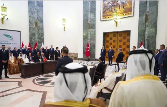 رعى رئيس مجلس الوزراء محمد شياع السوداني، والرئيس التركي رجب طيب أردوغان، في بغداد امس الاثنين، مراسم توقيع مذكرة تفاهم رباعية بين العراق وتركيا وقطر والامارات، تهدف الى التعاون المشترك بشأن (مشروع طريق التنمية) الستراتيجي، وذلك بحضور أعضاء الوفدين التركي والعراقي، من وزراء ومستشارين.
