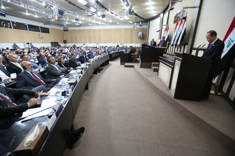 أعلنَ رئيس مجلس النواب سليم الجبوري عن وصول 43 مشروع قانون الى مرحلة التصويت لكن لم تتم ادراجها على جدول الاعمال لتلكؤ اللجان المعنية بأنجازها بشكل كامل. وذكر بيان للمجلس ان “مجلس النواب ضيّف في جلسته الاعتيادية التاسعة عشرة برئاسة سليم الجبوري وبحضور 267 نائبا امس السبت، بان كي مون الأميــن العــام للأمـــم المتحــدة وجيم يونغ كيم رئيــس البنـــك الدولــي واحمد المدني رئيــس البنــك الأسلامــي فيما انهى القراءة الاولى والثانية لثلاثة قوانين”. وفي مستهل الاستضافة اكد الرئيس الجبوري ان “الزيارة التاريخية للامين العام للامم المتحدة ورئيس البنك الدولي ورئيس البنك الاسلامي تعبر عن تضامن المجتمع الدولي مع العراق ووقوفه الى جانبه في مواجهة التطرف”. واشار رئيس مجلس النواب في كلمته خلال الجلسة الى ان “العراق لديه تصميم راسخ على الاستمرار بالتحرير والاصلاحات الاقتصادية والمصالحة المجتمعية وان تتكامل العملية السياسية التي تبنى عليها منظومة الحوكمة في العراق مع ستراتيجية الامم المتحدة التي تمثل انتقالة مهمة من اجل خفض مستوى الفقر في العالم وتمكين الحكومة الديمقراطية والتنمية المستدامة”. وفي كلمته خلال الجلسة عبر بان كي مون الامين العام للامم المتحدة عن سعادته بزيارة العراق، مشيرا الى ان الامم المتحدة تدعم الصمود والصبر الكبير للشعب العراق، ودعا بان كي مون جميع القادة في العراق للوصول الى رؤية موحدة للمصالحة الوطنية تستند على الوحدة والتسويات وخدمة تطلعات الشعب وخاصة الشباب والاقليات. داعيا دول جوار العراق والمجتمع الدولي لدعم العراق ومساعدته في مواجهة داعش. من جهته قال مدير البنك الدولي جيم يونغ كيم خلال كلمة له في جلسة مجلس النواب ان “الطريق الى تحقيق الأستقرار والنمو المشترك في العراق يكمن في تمكين الحكومات المحلية والأنفتاح وتنويع الأقتصاد وتحسين ألادارة المالية العامة عن طريق اصلاح القطاع العام وزيادة المساءلة القانونية”. واضاف جيم يونغ كيم ان “العراق اختار طريق المشاركة السياسية وهو قرار خلق تحديات صعبة ويبشر بالكثير من الخير، كما انه يتطلب تقديم تنازلات سياسية لبناء تحالفات واسعة لتحقيق الاهداف الوطنية وأشار رئيس البنك الدولي الى مشروع يدعمه البنك الدولي تبلغ قيمته 350 مليون دولار لإعادة بناء وأعمار المناطق التي تم تحريرها من تنظيم داعش، حاثا اعضاء مجلس النواب على التوحد بشأن جهود الانفتاح وتنويع النشاطات الأقتصادية كخطوة هامة في عملية لاطلاق الطاقات والقدرات الهائلة التي يمتلكها العراق”. من ناحيته قدم الامين العام للبنك الأسلامي للتنمية أحمد محمد علي المدني التعازي لضحايا التفجير الارهابي الذي استهدف ابناء مدينة الاسكندرية في محافظة بابل، مؤكدا على مساندة البنك الاسلامي للعراق وشعبه في محنته الحالية. وفي شان اخر دعا الجبوري اللجان النيابية الى تقديم مقترحات او تقارير تقييمية لاداء الوزراء او الوزارات ليتسنى للمجلس محاسبة ومساءلة اي وزير مقصر منوها الى ان مجلس النواب مرهون بارادة نوابه الذين انتخبهم الشعب العراقي ولايخضع لاي ضغط او سلطة سوى سلطة الدستور والقانون مع التقدير لكل مساعي الاصلاح والنوايا المخلصة التي تسعى لخدمة البلد. وطالب رئيس مجلس النواب اللجان النيابية الى تقديم تقييم لاداء الجهات التنفيذية ليتم عرض تقرير بهذا الشان خلال جلسات المجلس المقبلة. وانجز المجلس القراءة الأولى لمشروع قانون إلغاء قرار مجلس قيادة الثورة المنحل رقم (100) لسنة 2000 والمقدم من اللجنتين القانونية والثقافة والأعلام نظرا لحل وزارة الثقافة والاعلام بموجب امر سلطة الائتلاف المؤقتة رقم (2) قسم (3) لسنة 2003 وانتفاء الحاجة اليه. ووجه الرئيس الجبوري احر التهاني والتبريكات بأسم المجلس لابناء المكون المسيحي الكلداني السرياني الاشوري بمناسبة عيد القيامة. وأكمل المجلس قراءة تقرير ومناقشة مشروع قانون وزارة الداخلية والمقدم من لجان الأمن والدفاع وال