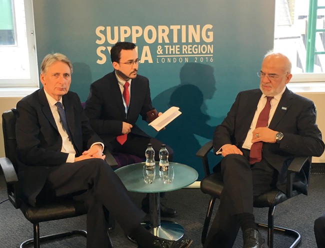 من جانبه رحّب هاموند بمُشارَكة العراق بوفد رفيع المُستوى في مُؤتمَر المانحين من أجل سورية، وبجُهُود الدبلوماسيّة العراقـيّة، وكلّ الجُهُود الرامية لتهدئة الأجواء المتوترة في المنطقة .
