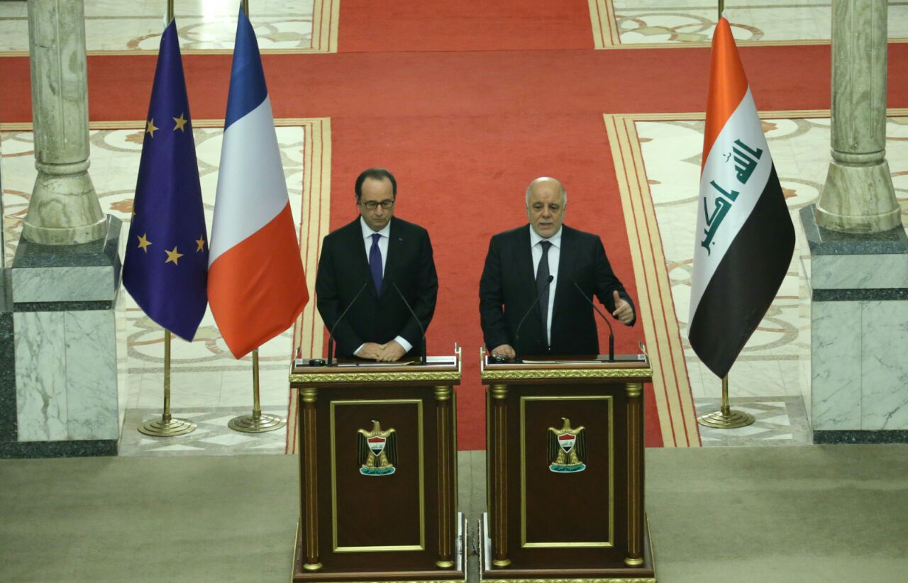 اكدَ رئيس الوزراء حيدر العبادي في مؤتمر صحفي مشترك مع الرئيس الفرنسي فرانسوا هولاند امس في بغداد ان “الإرهاب يضرب المدنيين ليعوض خسارته، ونحن قادرون على تقصير عمر الإرهاب”، واضاف “استطعنا تقليل فترة القضاء على داعش ونعمل على اختصار الوقت اكثر ونستطيع القضاء على داعش بالتعاون الجميع”. مشددا ان “هذا الامر جاء نتيجة القدرات العراقية الكبيرة في محاربة الدواعش”. وتابع العبادي “وكانت هناك توقعات كبيرة وتخمينات حول الفترة المفترضة للقضاء على داعش ، لكن قدرات العراقيين انهت الكثير من التوقعات وقصرت فترة التحرير”، مشيرا الى انه “لا توجد قوات من التحالف الدولي وغيرها تقاتل في الأرض وانما فقط القوات العراقية والانباء التي تناقلتها بعض وسائل الاعلام والتواصل الاجتماعي غير صحيحة”. واكد “اننا مستمرون بإعادة النازحين الى مناطقهم المحررة في الساحل الايسر وإعادة الاستقرار اليها، ونحتاج الى مساعدة لاعادة الاستقرار”. وأشارالعبادي الى ان “هناك الكثير من التنسيق الدبلوماسي ويجب ان يرافقه خطوات استخبارية لان العراق يواجه منظمة إرهابية عالمية فيجب ان يكون هناك تعاونا استخباريا عالميا للقضاء على الإرهاب”. ونوه الى ان “هناك حملة كبيرة لاعادة الحياة الى المدارس في المناطق المحررة وسنهتم بالأطفال من اجل إزالة التراكمات التي خلفتها عصابات داعش الإرهابية”. بدوره قال الرئيس الفرنسي فرانسوا هولاند “اردت ان كون في بغداد في بداية العام الجديد للتعبير عن التضامن مع الشعب العراقي في حربه ضد الإرهاب”، مبينا “في زيارتي السابقة للعراق كان الوضع خطير وكان الإرهاب قد استولى على مدن ووصل الى بغداد لكن القوات العراقية تمكنت من إعادة المدن العراقية وإعطاء الامل من جديد”. وأضاف “حتى لو لم تتوقف الهجمة الإرهابية الا ان داعش يتراجع وسوف يهزم ونحن نرى هذا في الموصل، ونحيي الانتصارات المتحققة في الموصل، وشجاعة العرقيين، ونؤكد وقوف فرنسا الى جانب العراق في تقديم الدعم والمساندة عبر الطائرات الحربية وبطريات المدفعية التي تسمح للقوات العراقي بالدخول للموصل وهناك قيد فرضناه على انفسنا وهو حماية المدنيين وهذا هو ما صممنا عليه ونتمنى ان توفقوا خلال العام”. واكد “ضرورة التوصل الى حلول سياسية ويجب اجراء المصالحة لمرحلة ما بعد انهاء الوجود الداعشي في العراق”، منوها الى ان “القضاء على داعش في العراق وبقاءه في الرقة وسوريا سيطيل عمر الإرهاب لذلك يجب القضاء على داعش في جميع المنطقة”. واكمل بالقول ان “القوات العراقية فقط هي التي تقاتل في الميدان وفرنسا تقدم الدعم الجوي لكن من يقاتل في الميدان هم العراقيون فقط، وعليهم ان يفخروا بتحقيق النصر وان المصير المحتوم في العراق وسوريا يؤثر على ما يحدث في اوروبا”. وأضاف “اعتقد ان المعركة الجارية في الموصل تجري لصالح القوات العراقية، ولم نتكلم اليوم عن سنوات لتحرير الموصل وانما عن أسابيع”. وحول إعادة اعمار المناطق المحررة قال فرنسوا “هناك تعاون في المجال الاستخباري وسيكون هناك معلومات خلال وبعد تحرير الموصل، وثم يجب ان يكون هناك تعاونا في إعادة بناء البنى التحتية لنينوى، ومرحلة ما بعد النصر للموصل يجب ان تتبعها مصالحة سياسية وتبني خطة شاملة لعادة التأهيل وفرنسا ستشارك بكل طاقتها”. وأضاف ان “فرنسا مستعدة لتنظيم مؤتمر دولي جديد لجمع تمويل والاسهام في اعادة اعمار الموصل”. وختم بالقول “هناك إرهابيون فرنسيون في الموصل والرقة ونقاتلهم حالهم حال بقية الإرهابيين وانهم شنوا الحرب علينا، واذا القت القوات العراقية على متهمين فرنسيين سيحاكمون وفق القضاء العراقي، واذا تمكنوا من العودة الى فرنسا ستحاكمهم المحاكم الفرنسية”، مشيرا الى ان “هناك أطفالا صغارا جدا تم غسل دماغهم واذا عادوا هؤلاء الأطفال الى فرنسا فعلينا معالجتهم، وهذه مسؤوليتنا”.