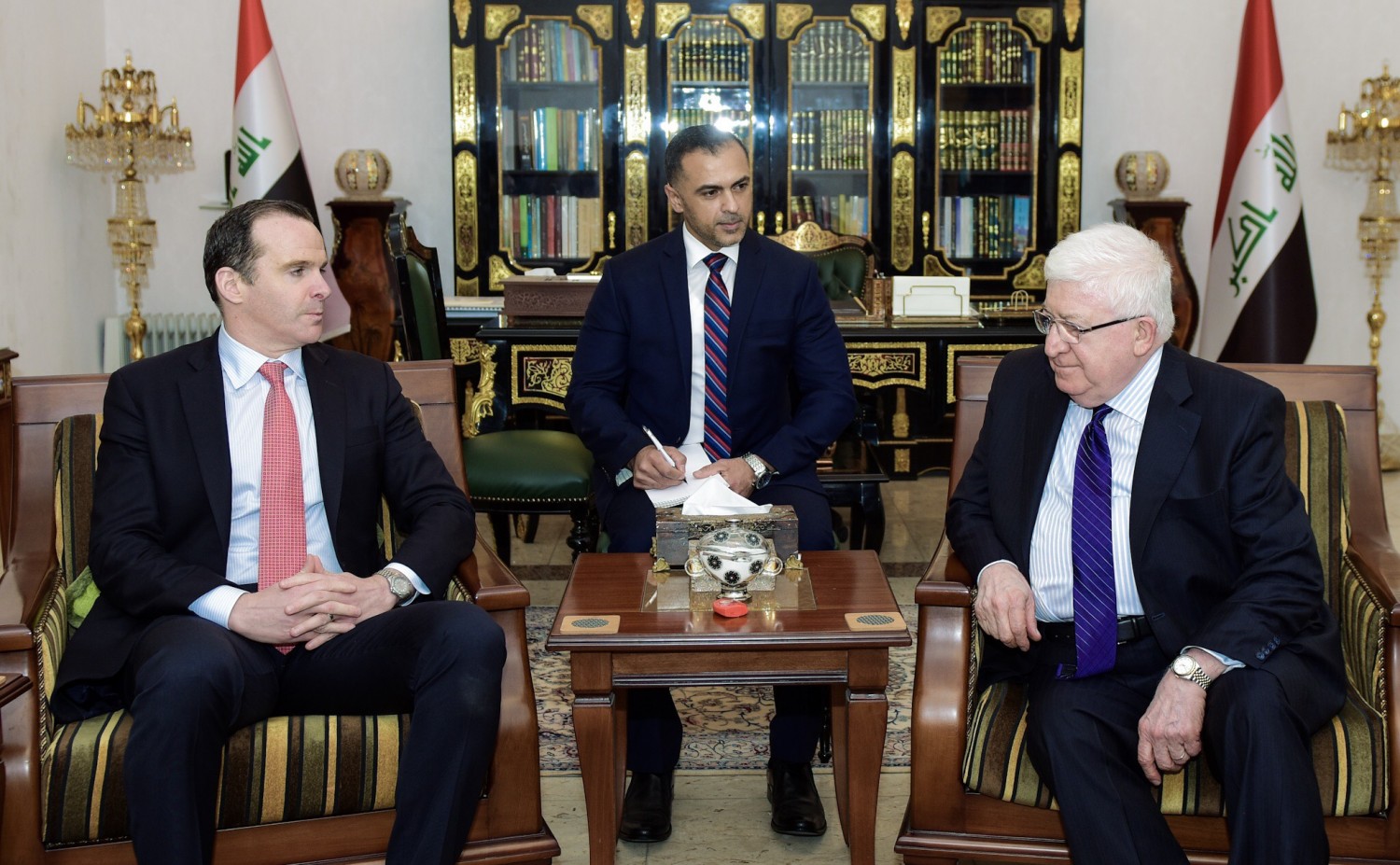وذكر رئيس الجمهورية في بيان رئاسي “خلال استقباله مبعوث الرئيس الأمريكي للتحالف الدول في الحرب ضد تنظيم داعش بريت ماكغورك،” إن إعادة اعمار الموصل وكافة المناطق المحررة من أيدي عصابات داعش الإرهابية وانجاز مصالحة مجتمعية إستراتيجية انطلاقا من اصغر الوحدات الإدارية باتجاه الأكبر فالأكبر حتى شمول مجمل المستوى الوطني هي الضمان الفعلي لإعادة الحيوية والازدهار إلى تلك المناطق في كافة المجالات”.وتابع البيان ان ” اللقاء بحث مجمل الأوضاع الأمنية والتطورات الإقليمية والدولية فضلا عن تطورات الحرب ضد الإرهاب، استعرض ماكغورك نتائج اتصالاته ومباحثاته الأخيرة مؤكدا استمرار بلاده بدعم العراق في كافة المجالات”.