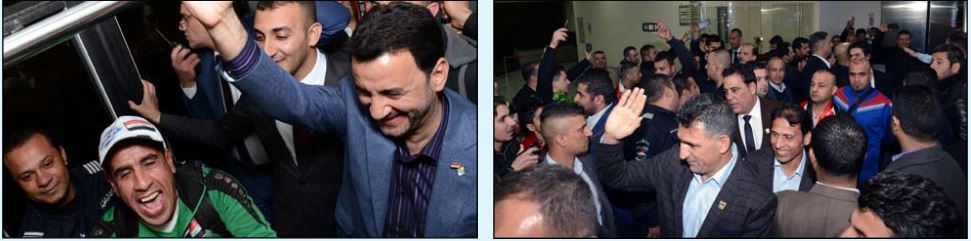 وصل المنتخب الأولمبي العراقي، الى مطار بغداد قادما من الدوحة حيث كان باستقباله جماهير رياضية وفية يتقدمها وزير الشباب والرياضة عبد الحسين عبطان ورئيس اللجنة الأولمبية العراقية رعد حمودي وشخصيات أخرى”.